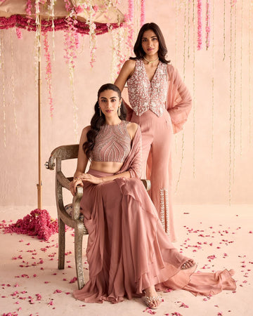 Subtle chiku tone lehenga with rich Banarasi silk elegance