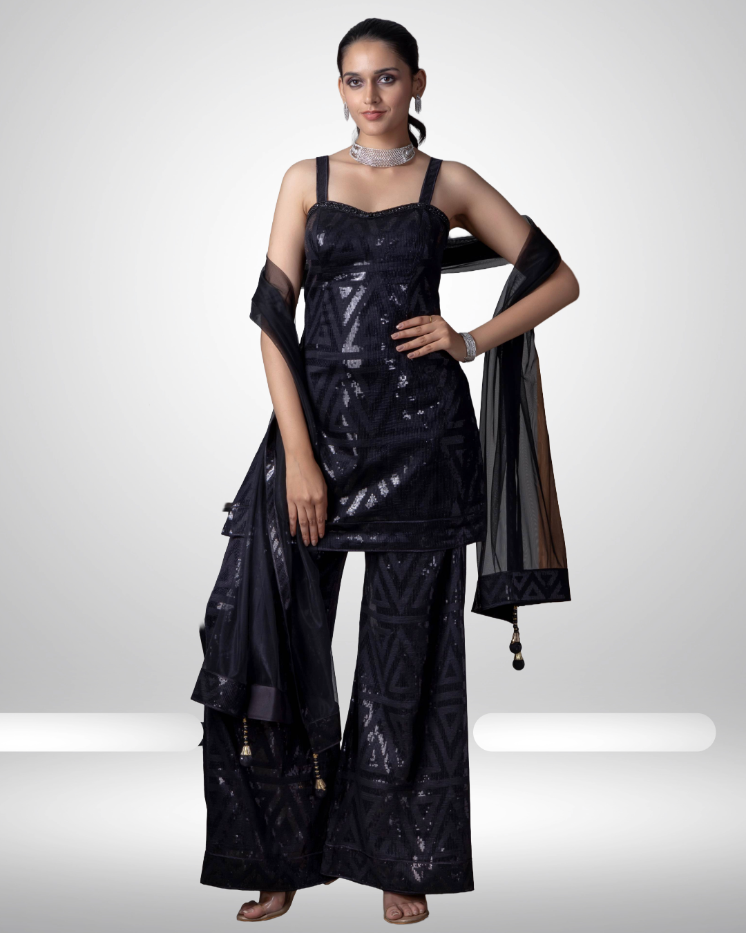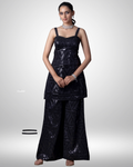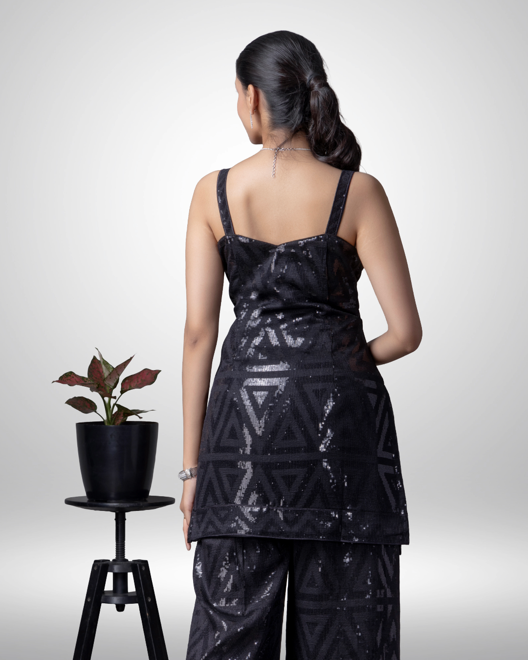This Black Palazzo Top Set, crafted in Polyester Silk, is designed for effortless chic. Ideal for parties and semi-formal occasions where comfort meets elegance.