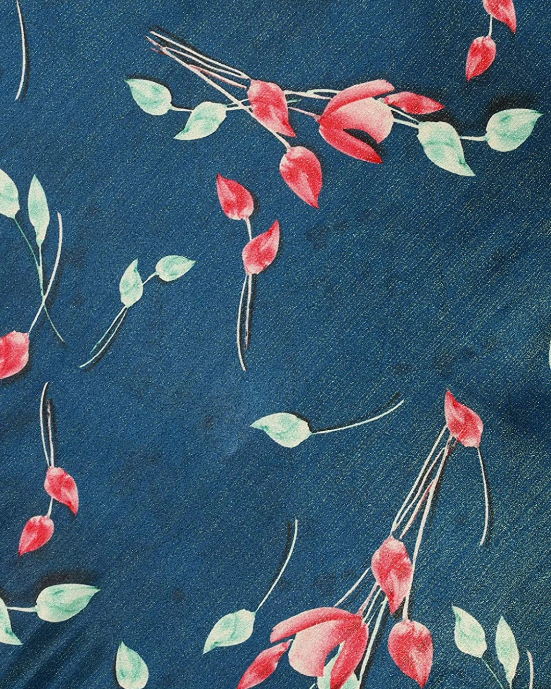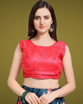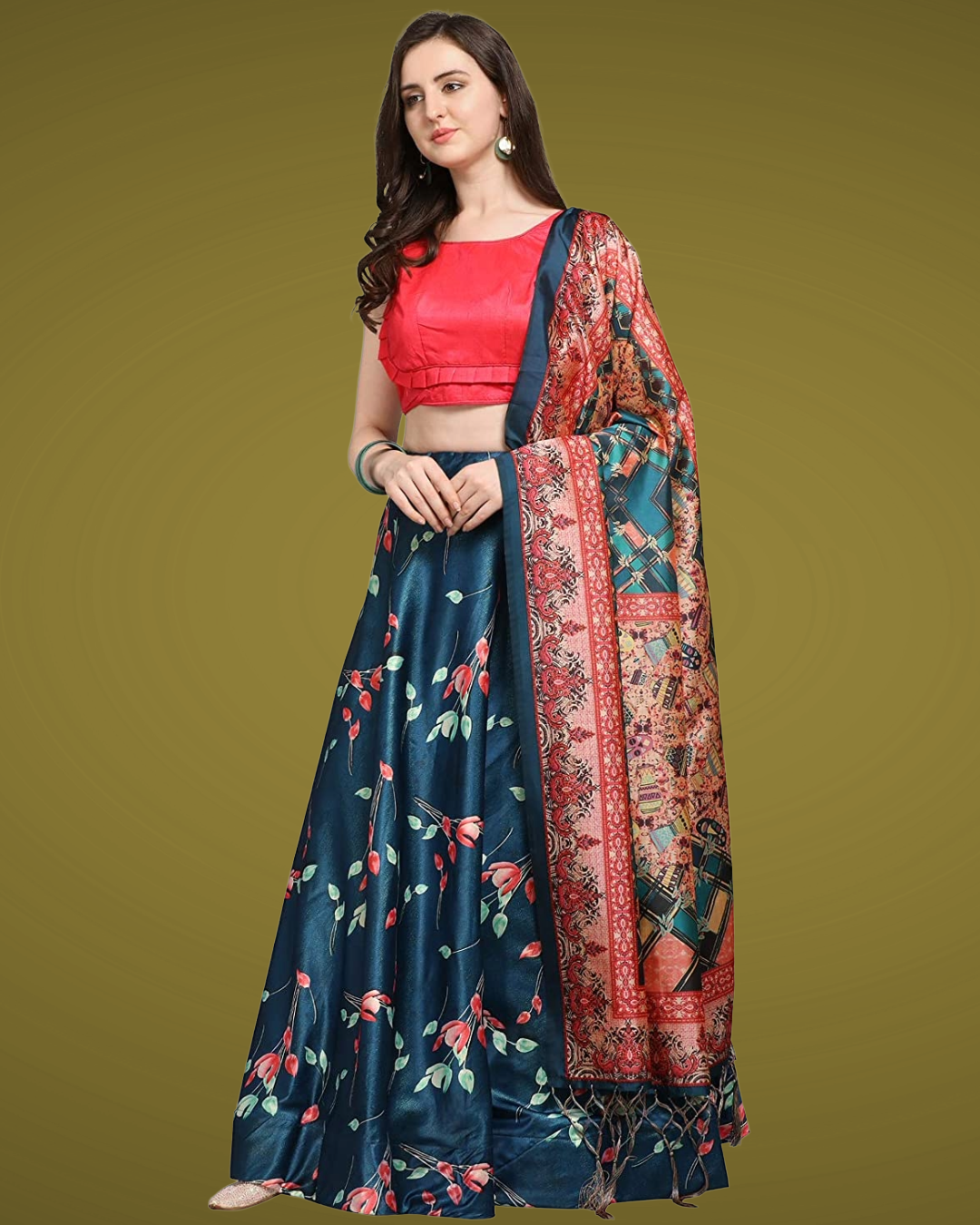 This blue satin silk lehenga choli is a blend of regal elegance and contemporary design. With a 4-meter flare and digital print work, it creates a stunning flowy silhouette. The shiny silk dupatta enhances the outfit with a graceful finish, making it a versatile festive and wedding choice.