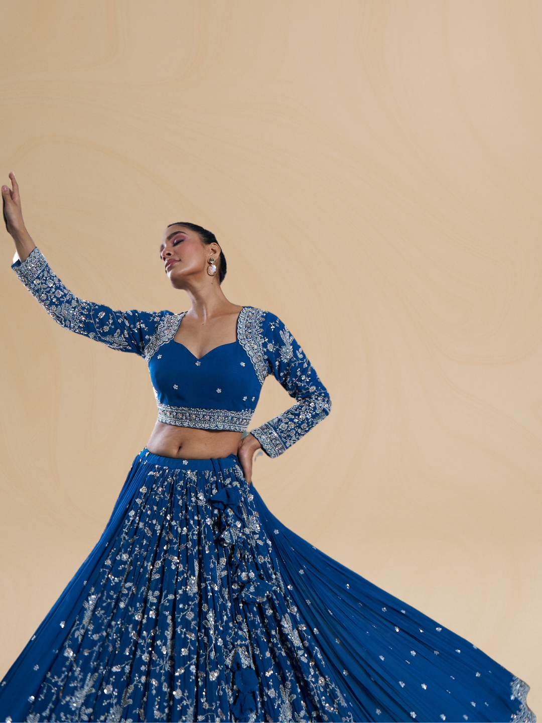 Step into timeless elegance with our Blue Viscose Banarasi Tissue Lehenga Choli, a masterpiece of traditional artistry and modern sophistication. Crafted from premium viscose Banarasi tissue fabric, this designer ensemble features a 5-meter stitched lehenga flair for a grand, royal look. The four-side embroidered border viscose tissue dupatta adds a regal finishing touch, making it perfect for weddings, receptions, festivals, and grand celebrations.