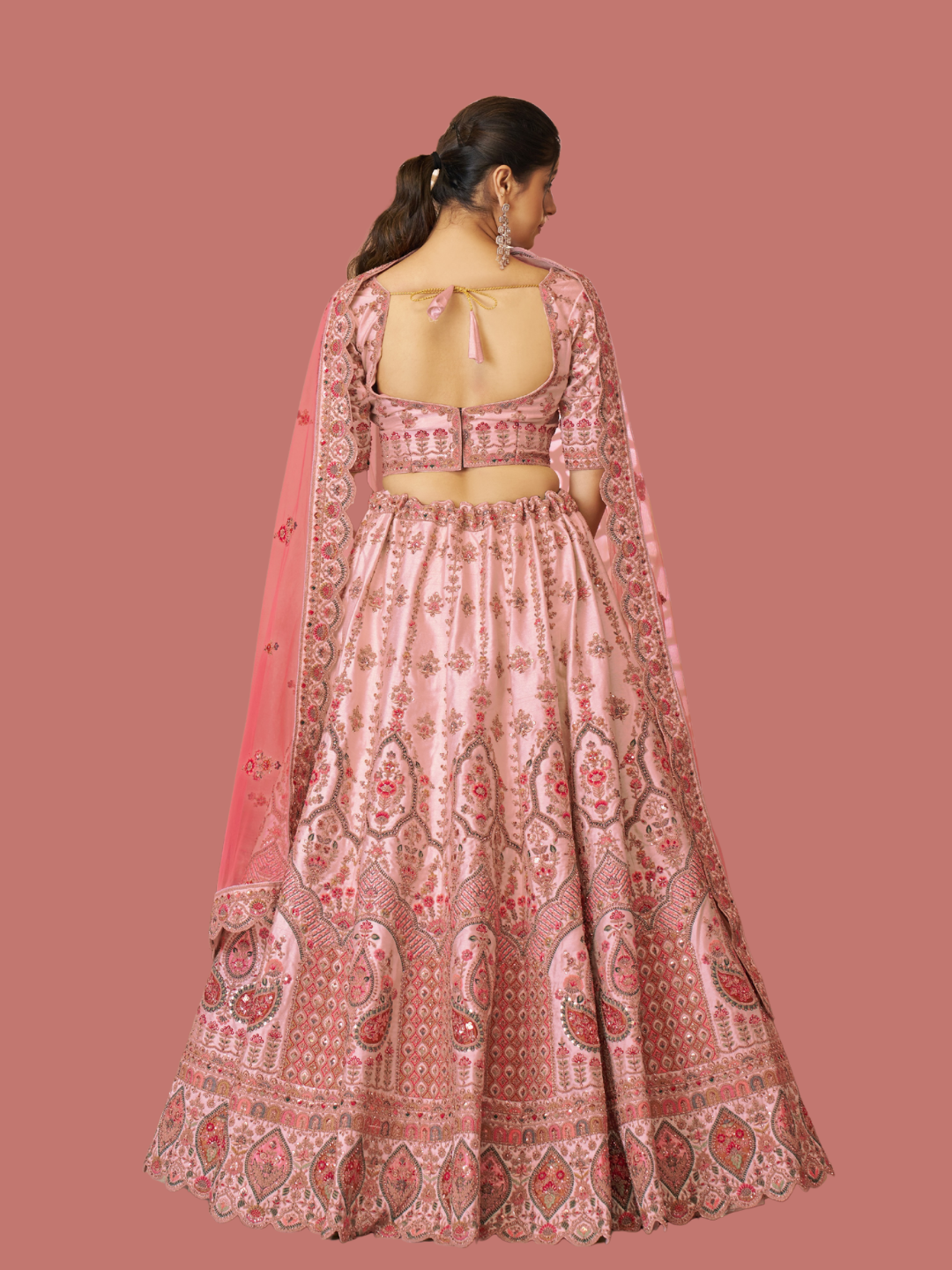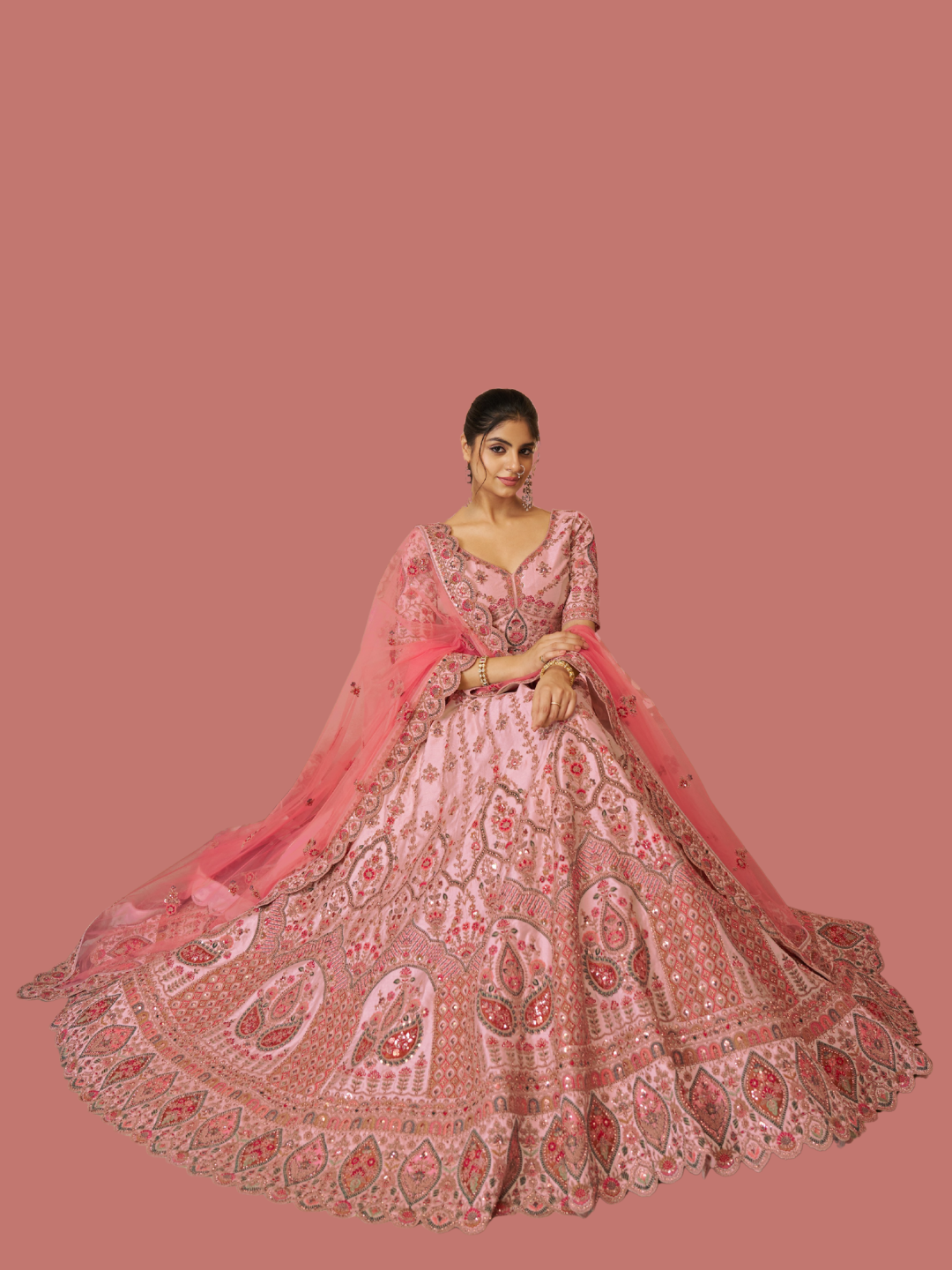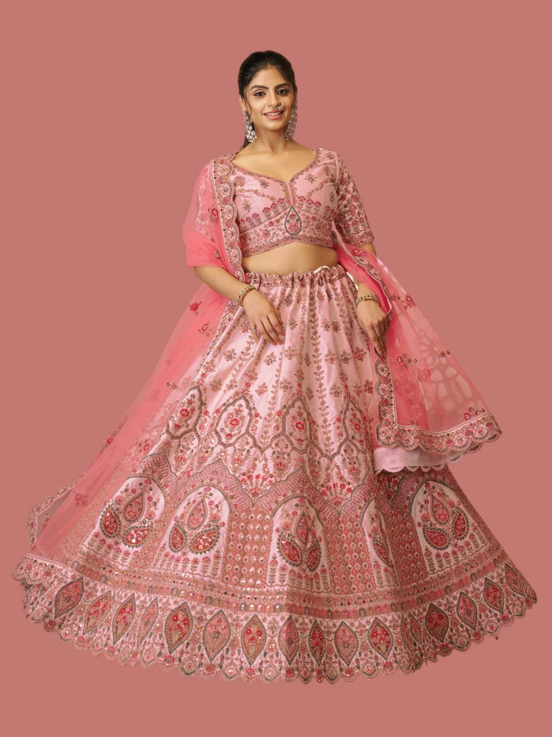 A semi-stitched lehenga in pink silk, paired with soft net dupatta and unstitched blouse. Perfect for weddings and celebrations.