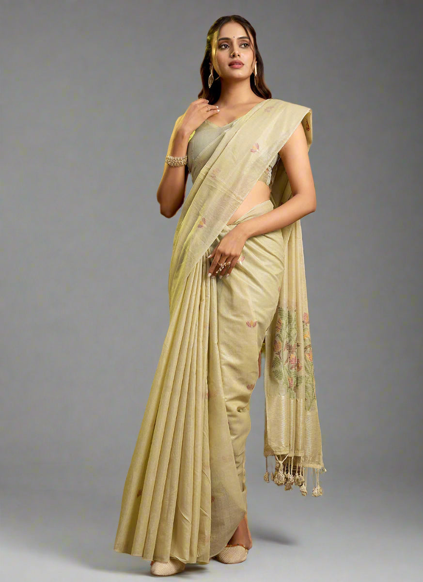 Cream Pure Cotton Jamdani Saree with Allover Leaf Butti & Floral Weaving