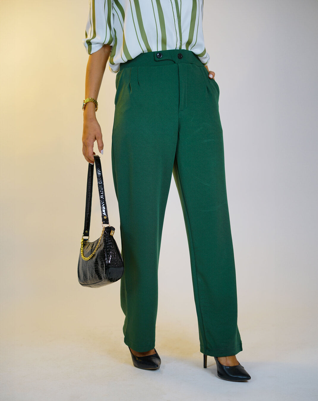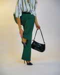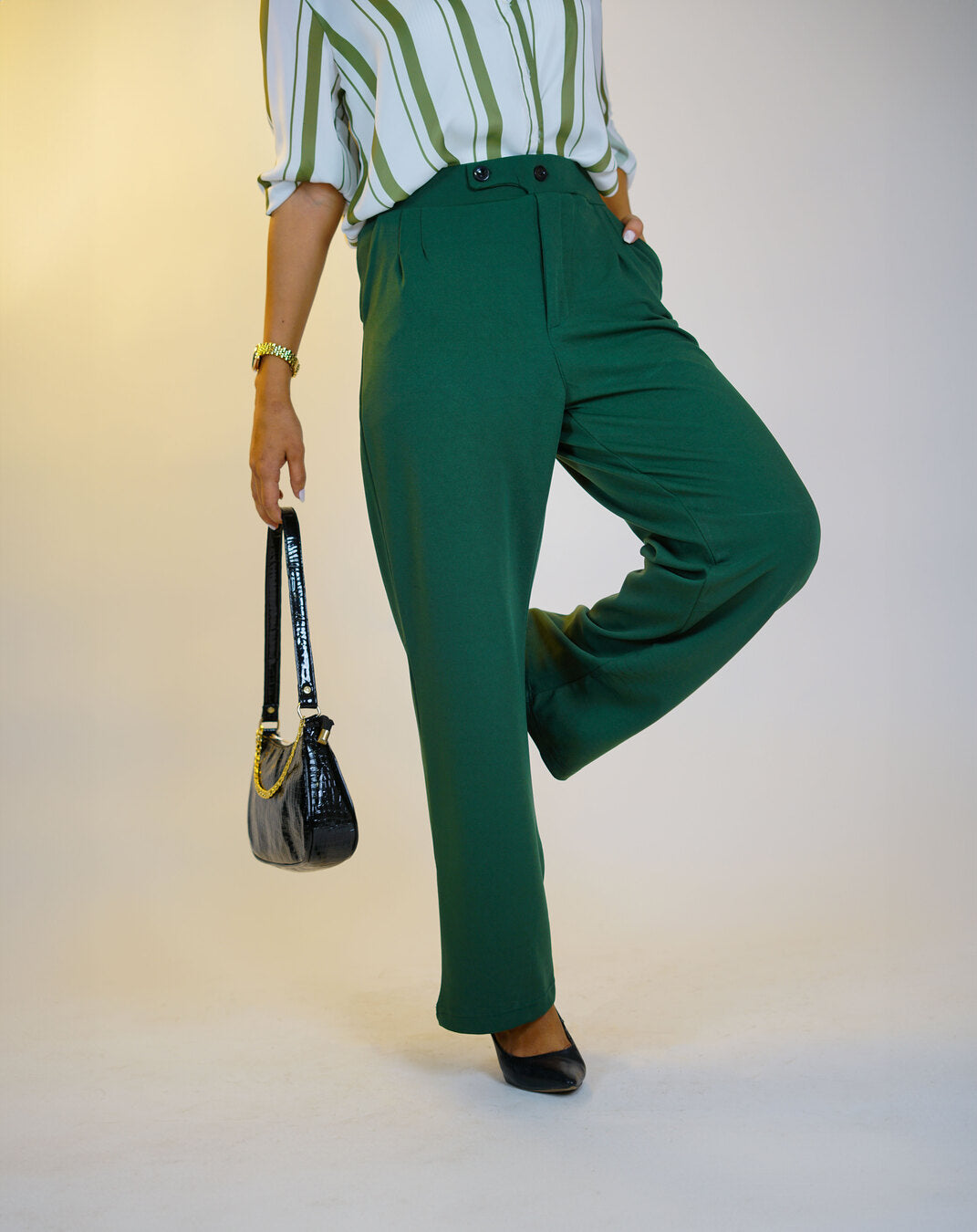 A timeless relaxed fit trouser in rich Dark Green Lycra Mose Crepe fabric. Lightweight, breathable, and flexible, this piece combines comfort with understated elegance, making it a wardrobe staple for versatile styling.