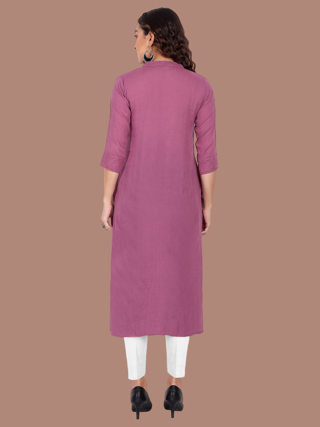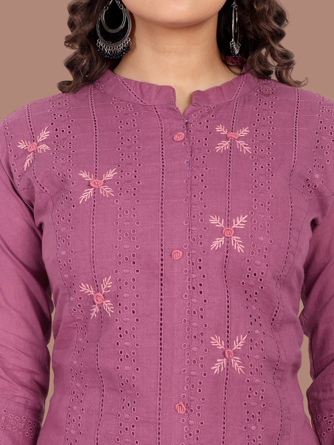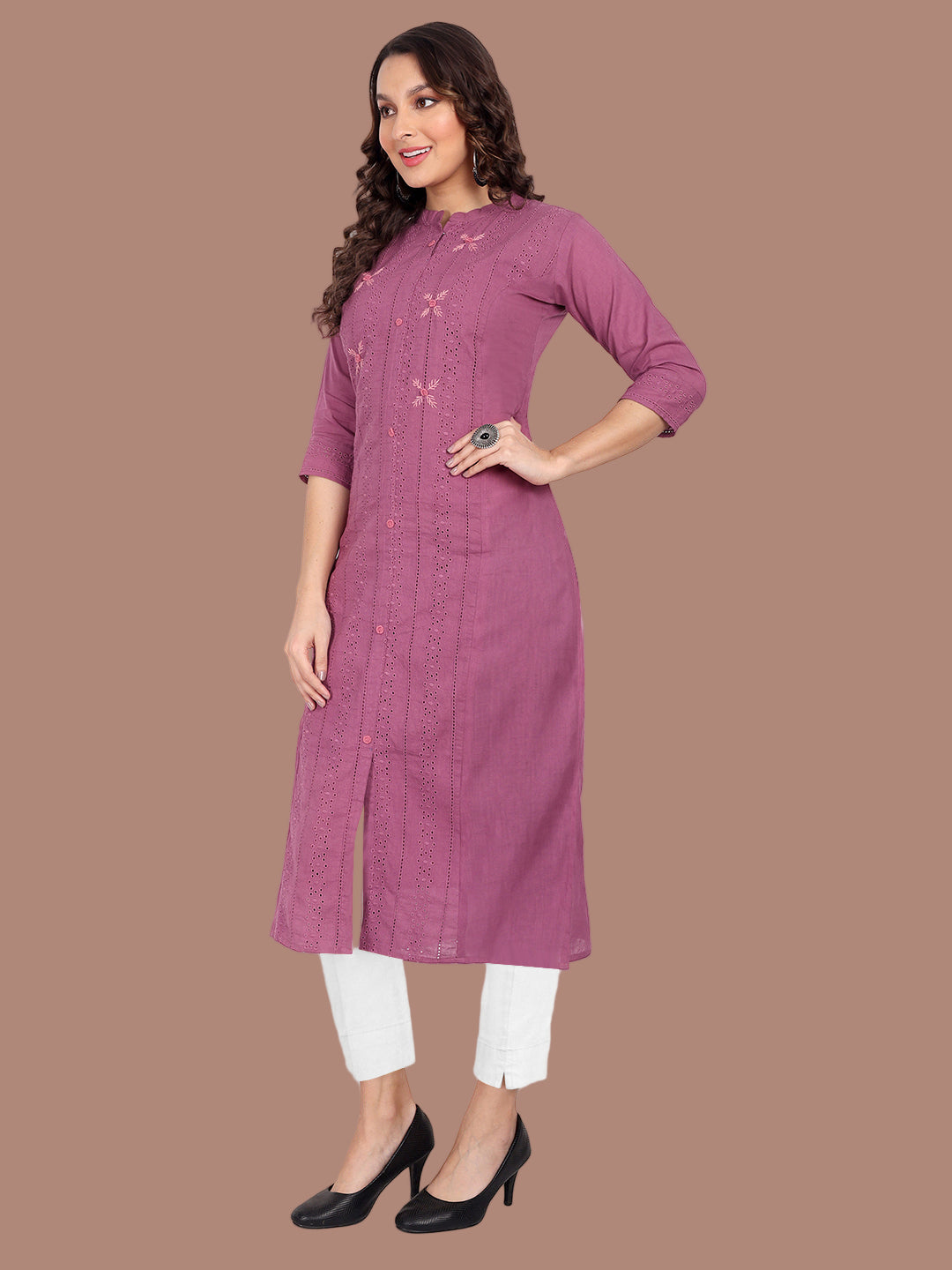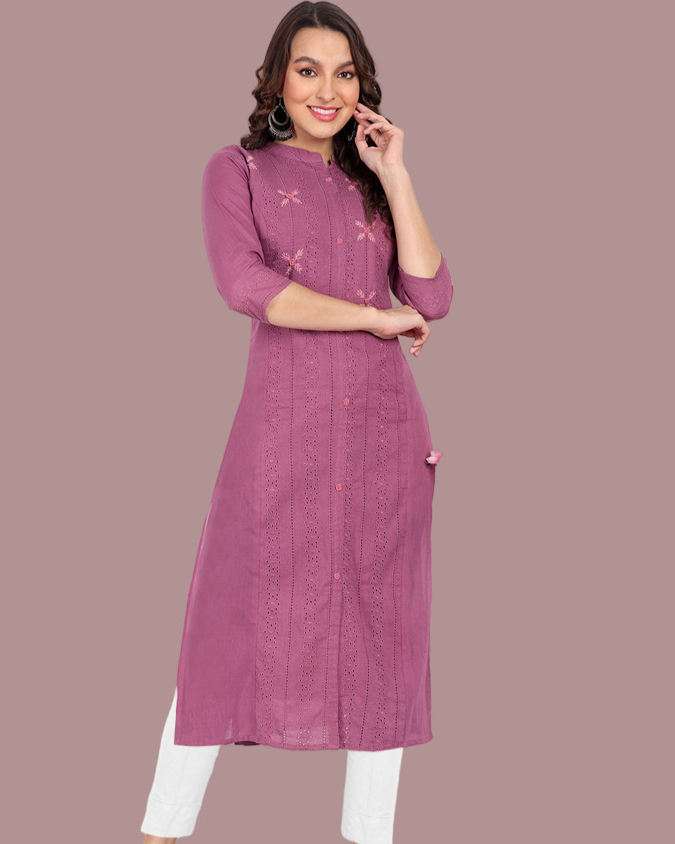 Crafted from cambric cotton, this pink kurti offers a flattering fit and vibrant appeal. Sizes M to 7XL.