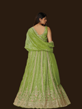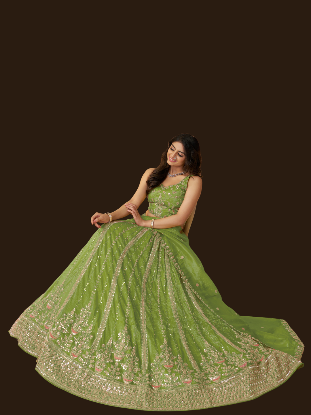 A semi-stitched lehenga in green Jimmy Choo fabric with soft net dupatta and unstitched blouse. Perfect for ethnic celebrations.