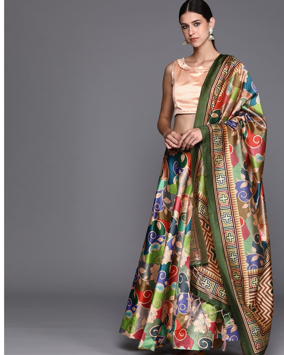 Components: Lehenga: Satin Silk Blend (4m flare, 42" length) Blouse: Silk (0.8m) Dupatta: Soft Shiny Silk (2.25m) Size: Semi-stitched, fits up to 42 inches
