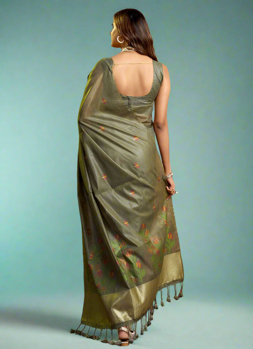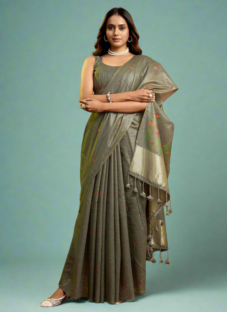 Elevate your ethnic wardrobe with this exquisite Grey Pure Cotton Jamdani Saree, beautifully crafted with traditional weaving artistry. Designed in a soft, breathable pure cotton fabric, this saree features allover leaf weave buttis, a delicate floral spun pattern, and an elegant contrasting border. The premium Jamdani weaving technique showcases timeless craftsmanship, making it perfect for festive occasions, cultural gatherings, and elegant day wear.