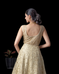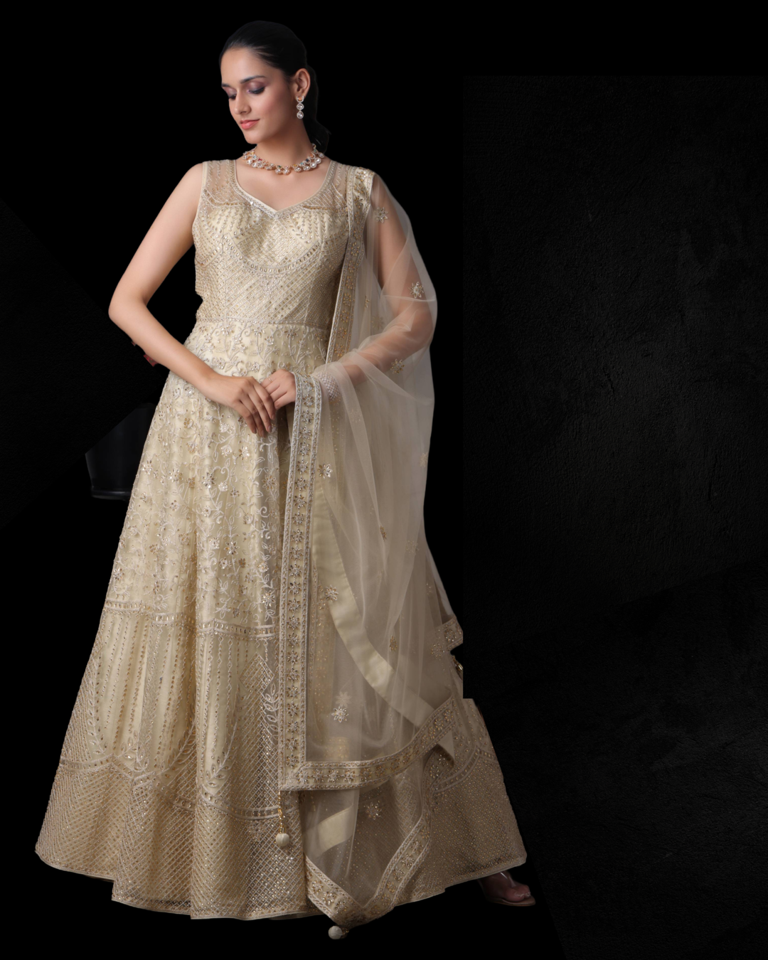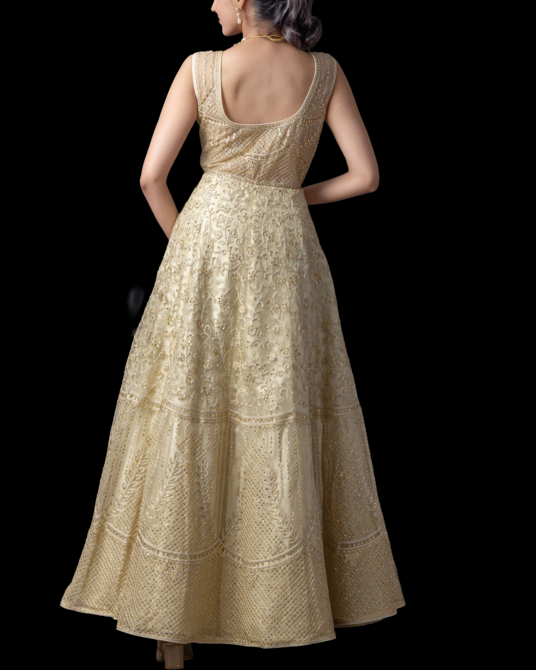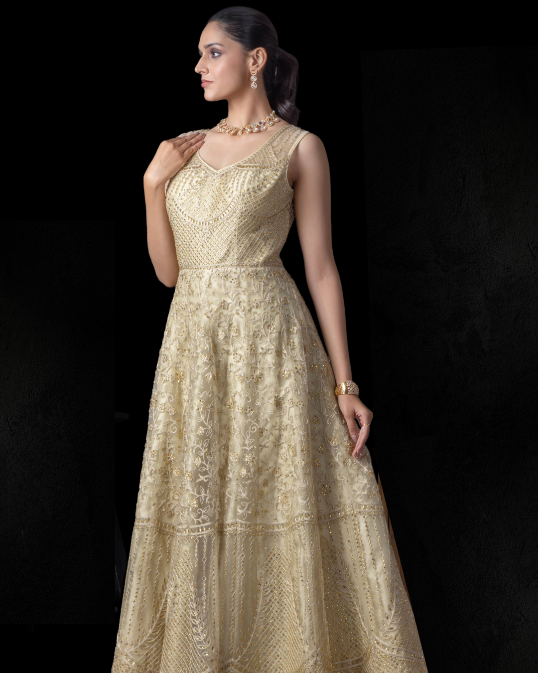 This Ivory Gold Gown in Butterfly Net is the epitome of grandeur. Its rich golden tone and sheer layers make it perfect for weddings, receptions, and evening soirées.