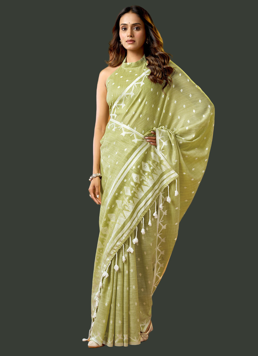 Elevate your ethnic wardrobe with this exquisite Mehendi Green Pure Cotton Jamdani Saree, crafted with timeless artistry. Featuring allover leaf weave buttis, a delicate floral pattern, and a finely detailed woven border, this saree blends tradition with elegance. The lightweight and breathable cotton fabric makes it perfect for all-day comfort, while the 6.30-meter length comes complete with a running blouse piece for a coordinated look. Ideal for festive occasions, weddings, cultural events, or everyday graceful styling.