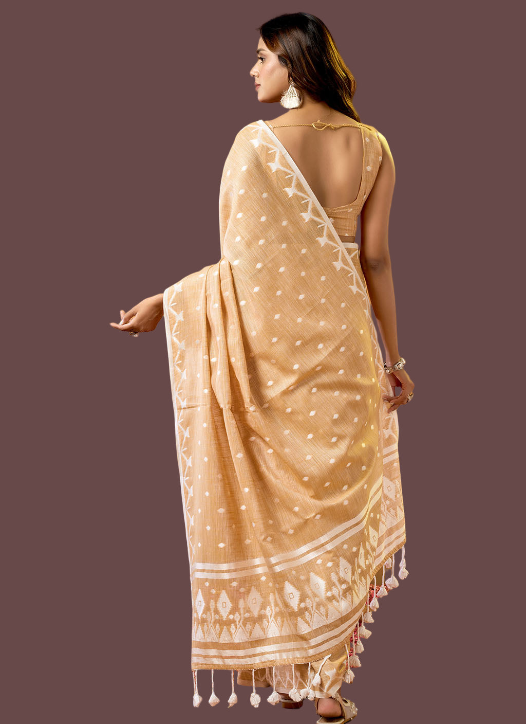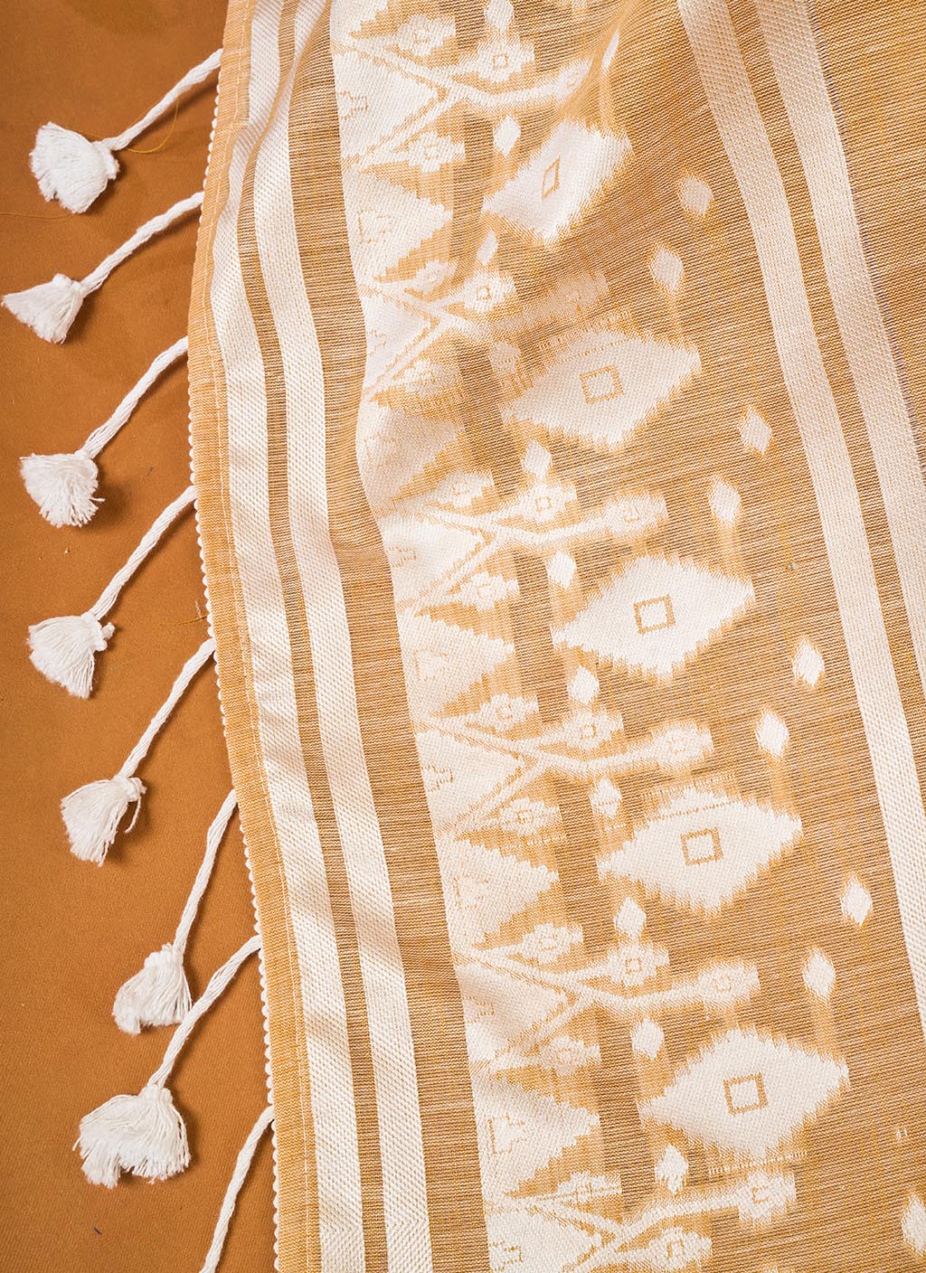 Elevate your ethnic wardrobe with this exquisite Mustard Yellow Pure Cotton Jamdani Saree, crafted with timeless artistry. Featuring allover leaf weave buttis, a delicate floral pattern, and a finely detailed woven border, this saree blends tradition with elegance. The lightweight and breathable cotton fabric makes it perfect for all-day comfort, while the 6.30-meter length comes complete with a running blouse piece for a coordinated look. Ideal for festive occasions, weddings, cultural events, or everyday graceful styling.