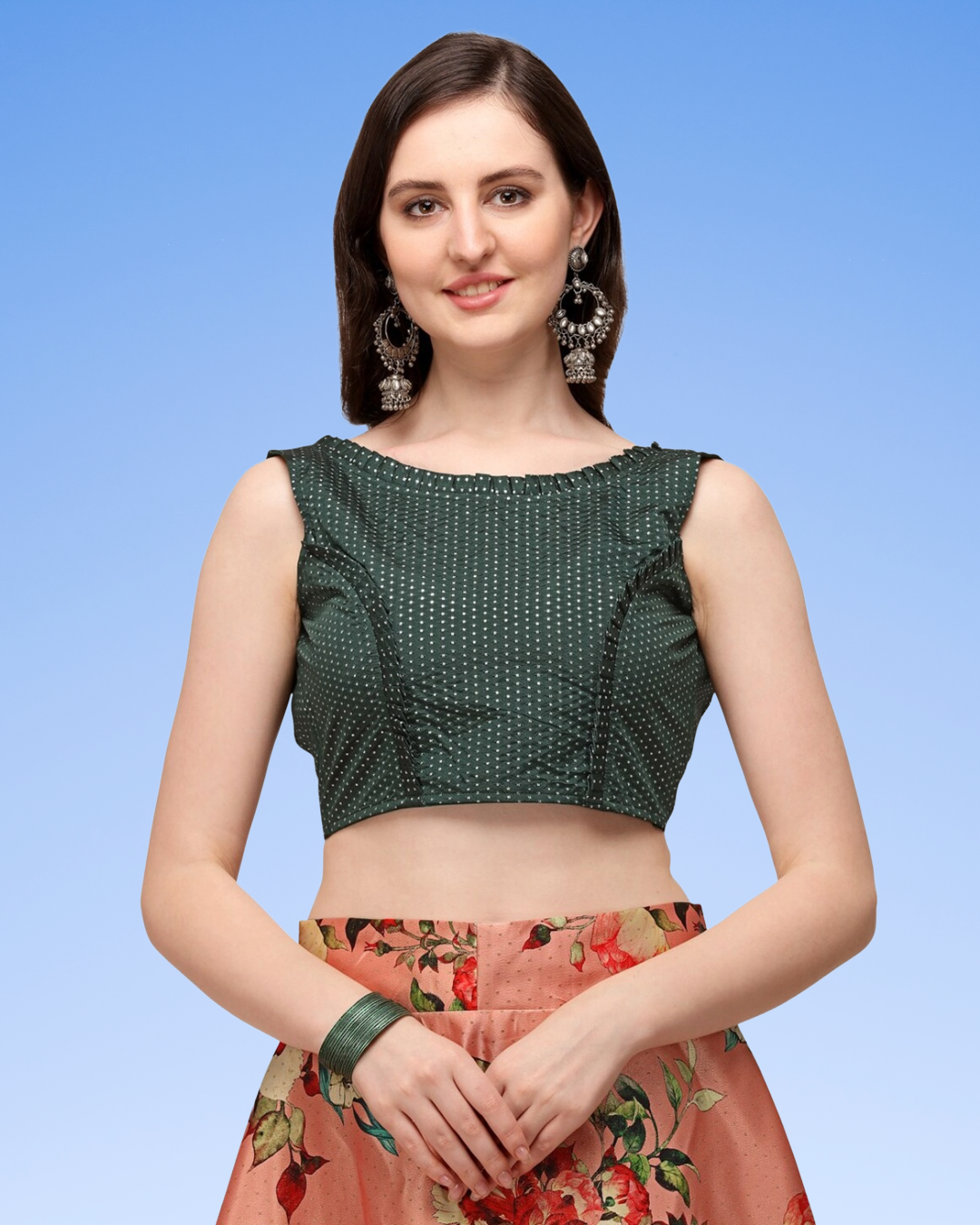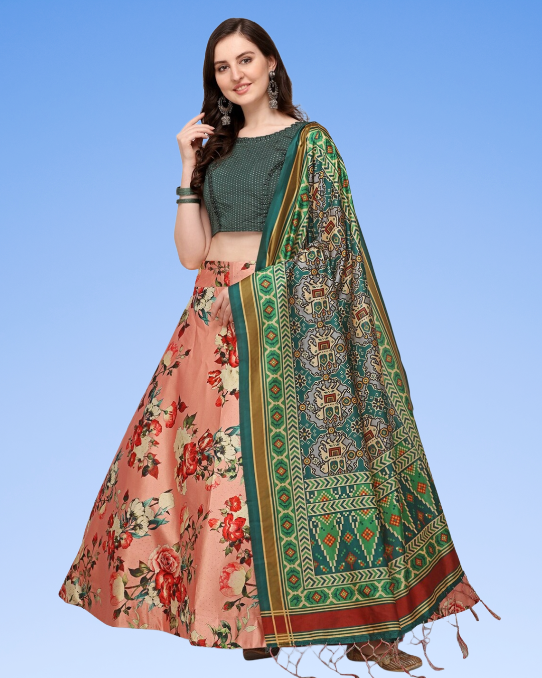 This soft peach Anarkali lehenga is the perfect outfit for wedding guests, festive rituals, and pre-wedding celebrations. Made from a satin silk blend, it showcases traditional digital print motifs with a matching silk blouse and a soft shiny silk dupatta for an elegant drape. A must-have for women seeking premium ethnic wear under 1600 INR. Components: Lehenga: Satin Silk Blend (4m flare, 42" length) Blouse: Silk (0.8m) Dupatta: Soft Shiny Silk (2.25m) Size: Semi-stitched, fits up to 42 inches 5. SKU: 70004 ? Emerald Green Festive Anarkali Lehenga Product Title: Emerald Green Satin Silk Anarkali Lehenga with Luxe Digital Design