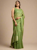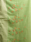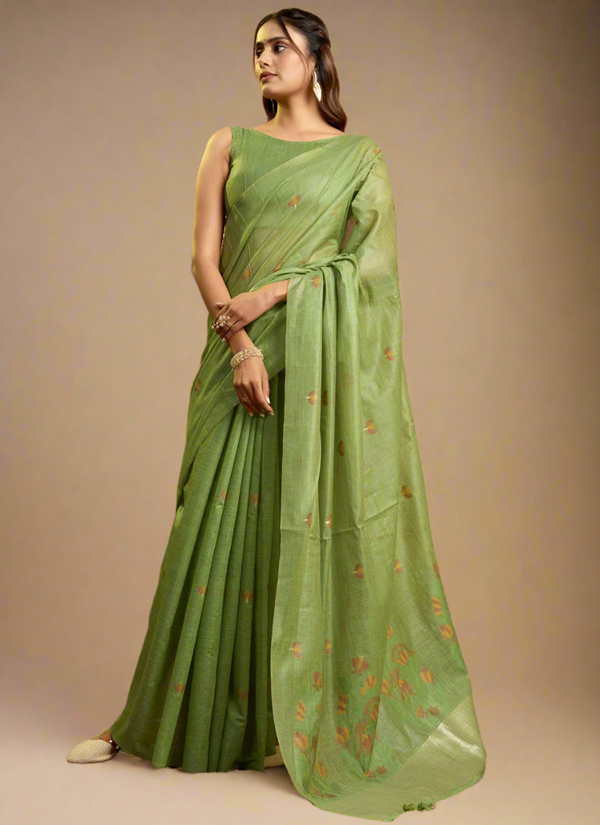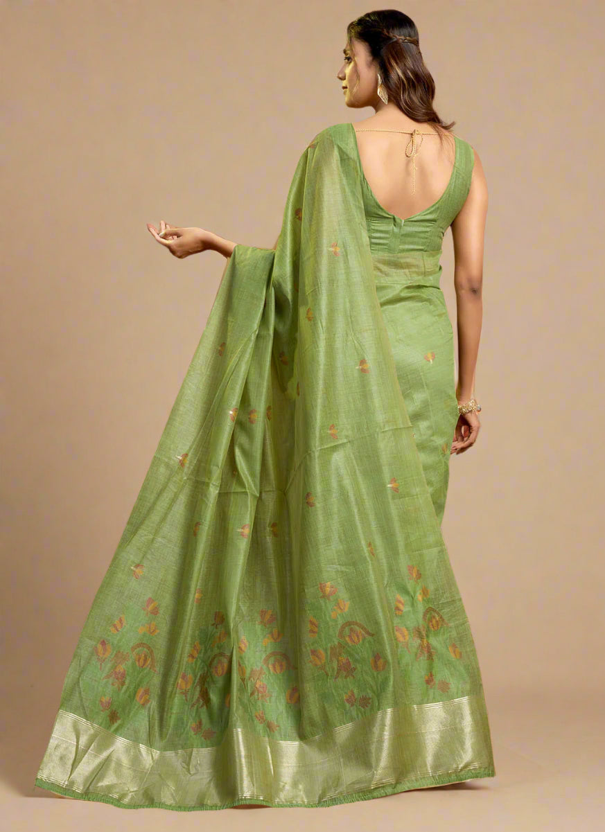 Pista Green Pure Cotton Jamdani Saree with Allover Leaf Butti & Floral Weaving