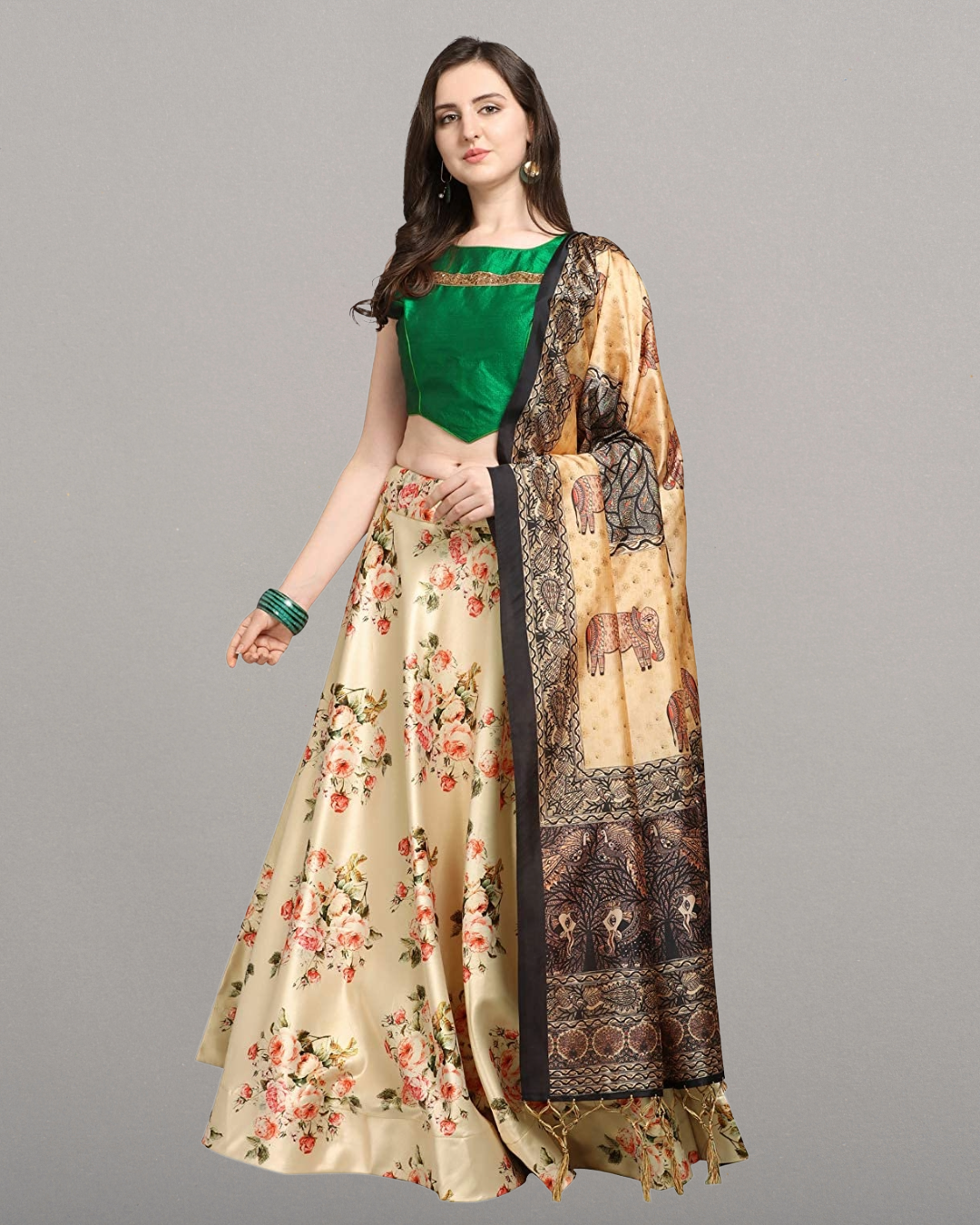 Premium Cream Satin Silk Blend Anarkali Lehenga Choli with Digital Print & Shiny Silk Dupatta