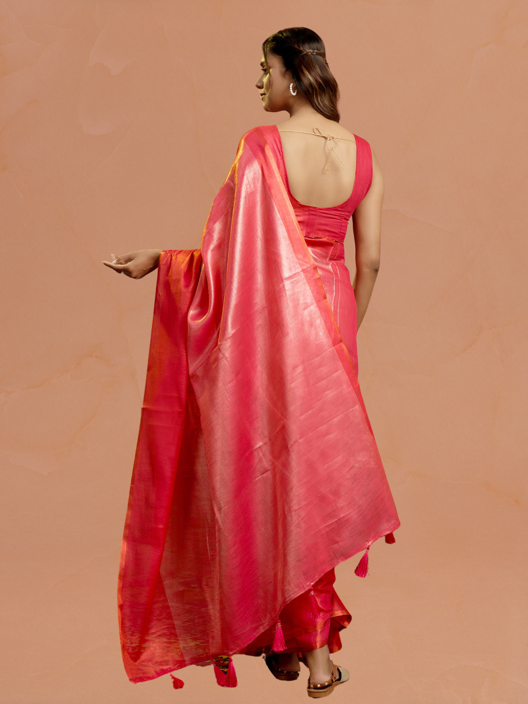 Elevate your ethnic wardrobe with this Red Plain Tissue Silk Saree, crafted from pure tissue silk for a luxurious sheen and elegant drape. The soft yet structured texture adds a regal charm, while the contrast weave border offers a striking visual appeal. Designed for both festive occasions and formal gatherings, this saree comes with a matching contrast blouse piece, allowing you to style it with versatility. Perfect for weddings, receptions, parties, and cultural celebrations, this timeless piece blends traditional artistry with contemporary sophistication.