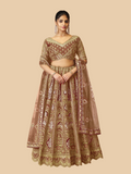 A semi-stitched lehenga in coffee tone, made from Banarasi silk with soft net dupatta and unstitched blouse. Perfect for weddings, receptions, and festive occasions.
