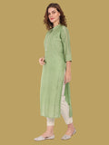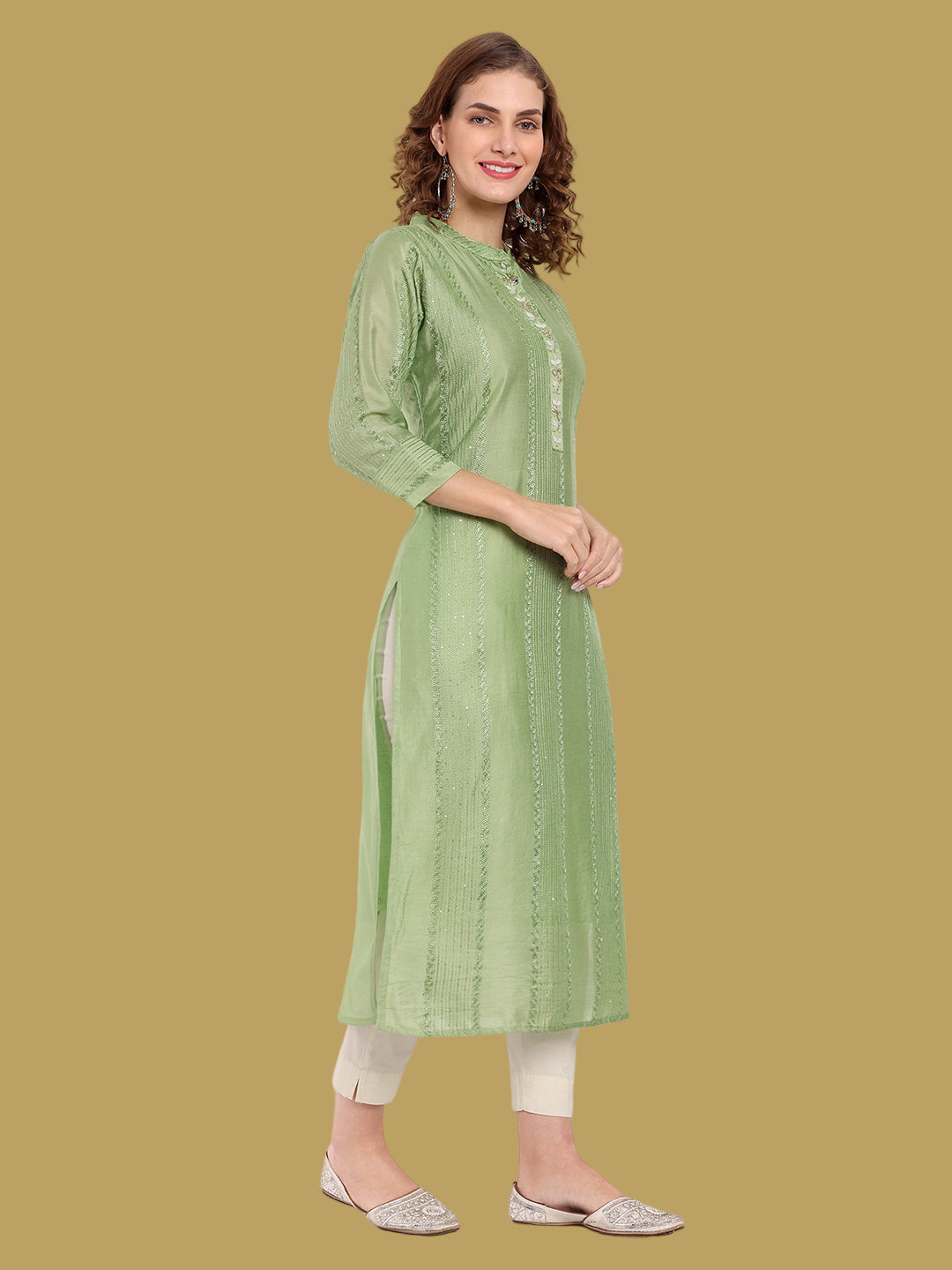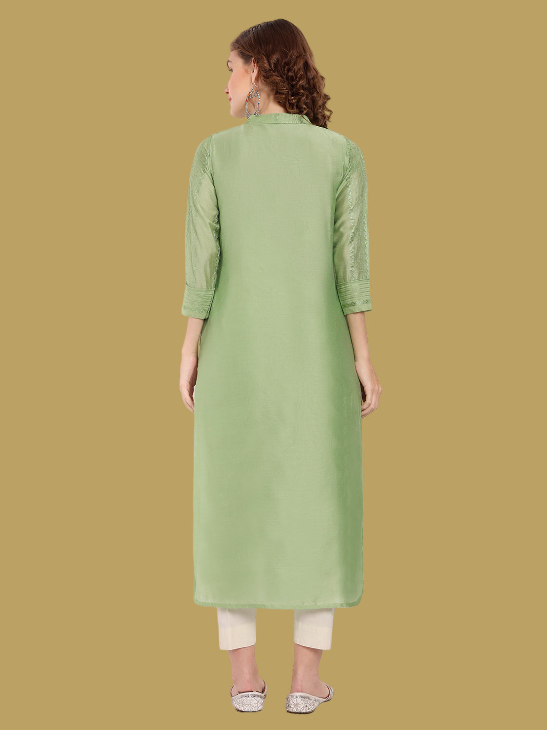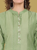 Crafted in chanderi silk, this green kurti offers a regal look for festive occasions. Sizes M to 7XL.