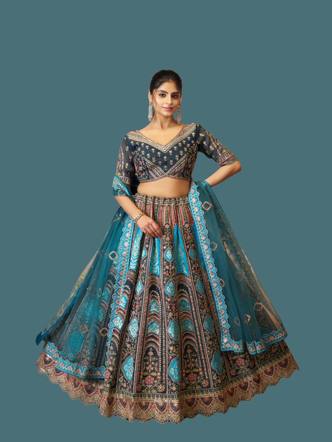 Royal Blue Banarasi Silk Semi-Stitched Lehenga with Net Dupatta