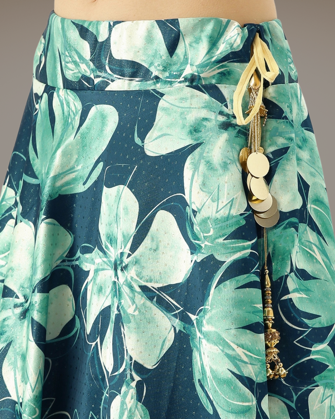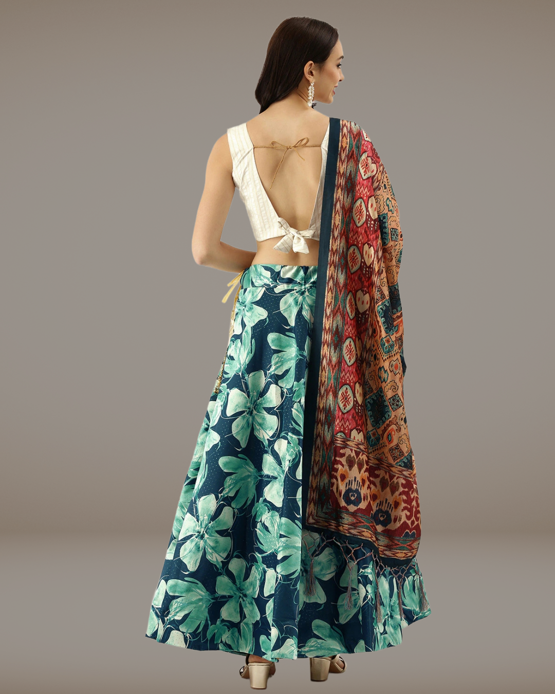 Add a royal charm to your wardrobe with this blue festive Anarkali lehenga, designed in satin silk blend with mesmerizing floral digital prints. Paired with a smooth silk blouse and a soft shiny silk dupatta, this lehenga is ideal for cocktail parties, Navratri nights, and wedding celebrations. A perfect pick for women looking to shop premium lehengas online that combine tradition with modern fashion. Components: Lehenga: Satin Silk Blend (4m flare, 42" length) Blouse: Silk (0.8m) Dupatta: Soft Shiny Silk (2.25m) Size: Semi-stitched, fits up to 42 inches