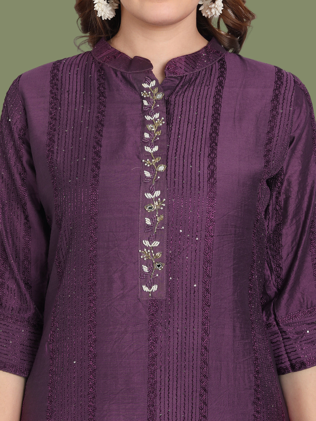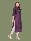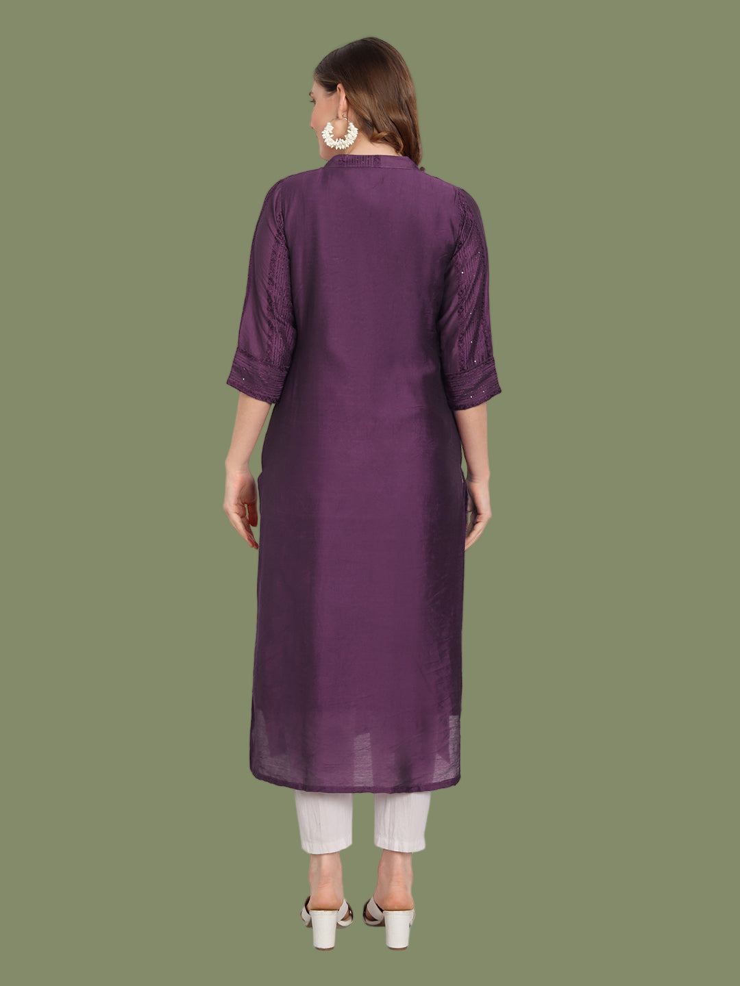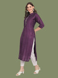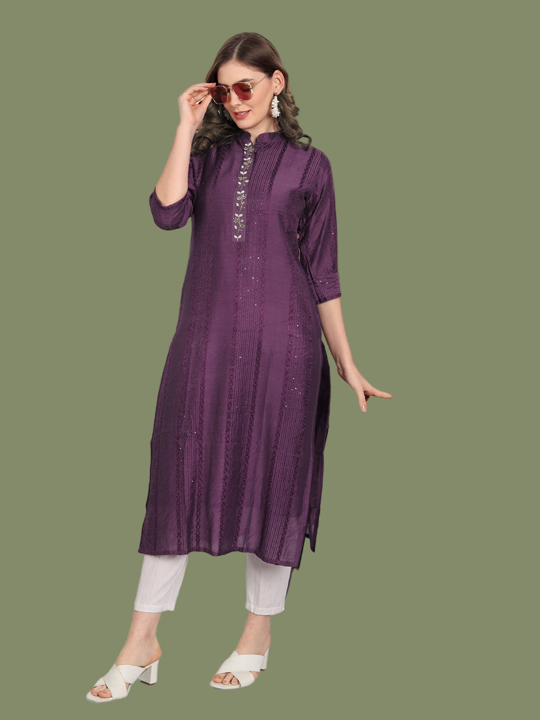 A purple chanderi silk kurti with a straight fit, ideal for ethnic celebrations. Sizes M to 7XL.