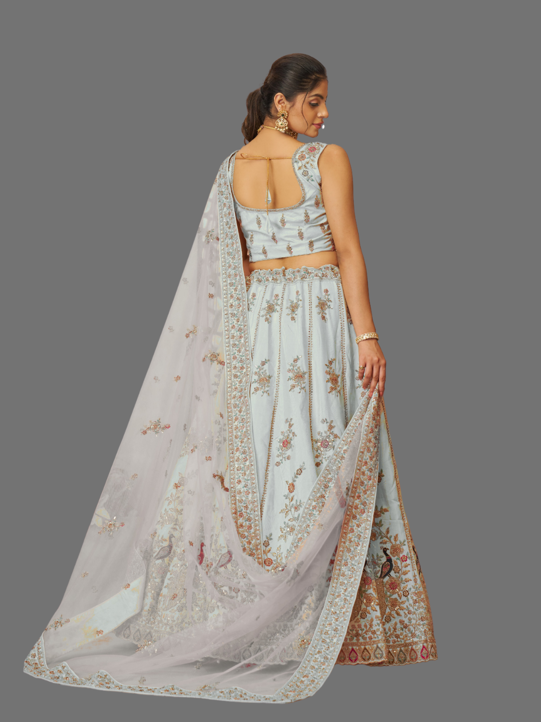 A semi-stitched lehenga in sky blue Zari silk, paired with soft net dupatta and unstitched blouse. Perfect for festive and traditional occasions.