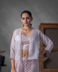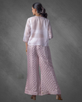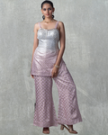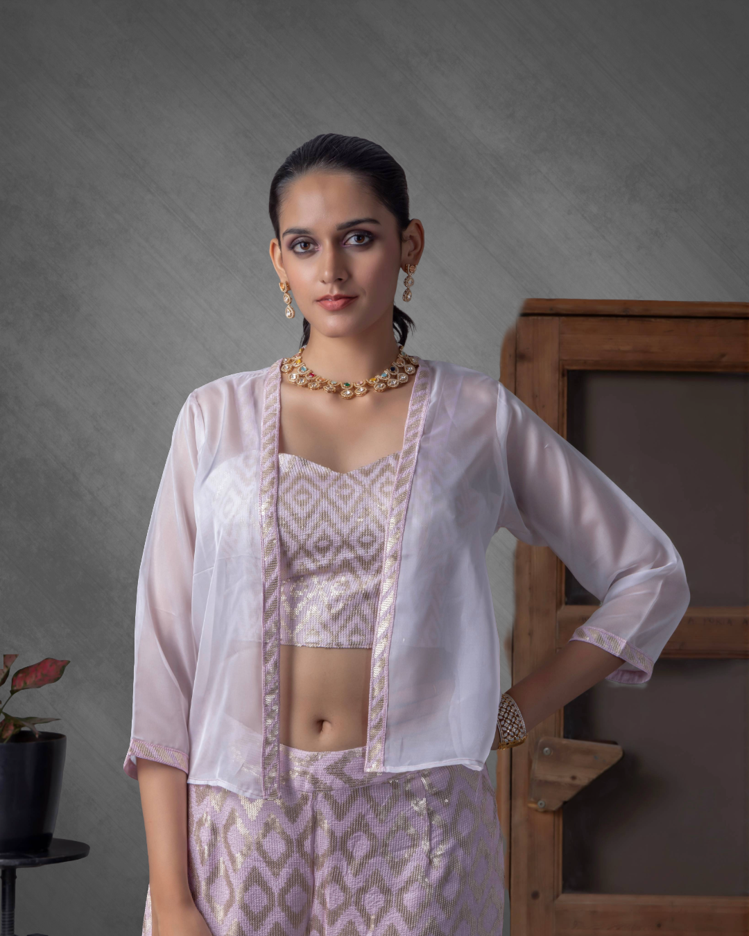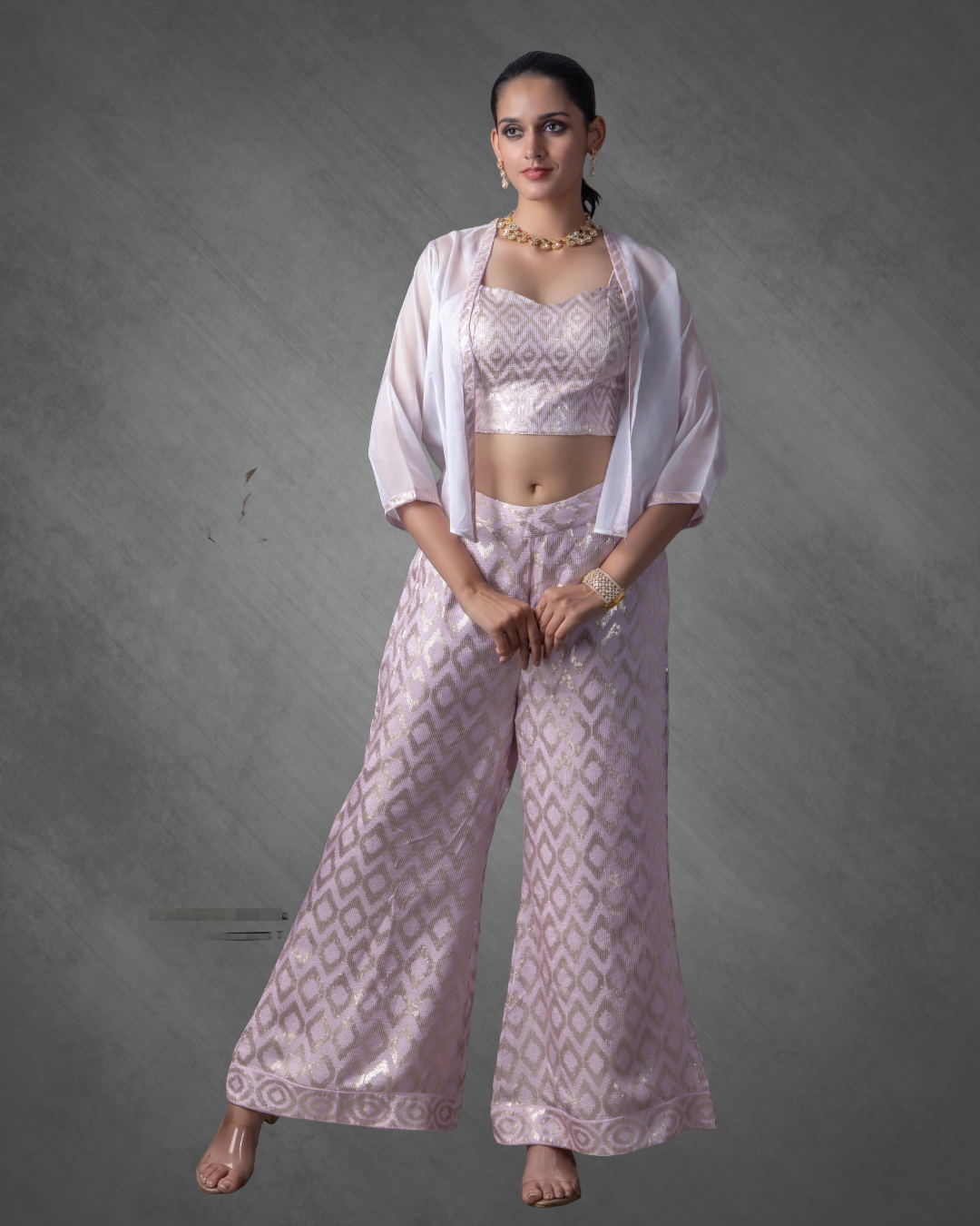 Featuring Pure HO Silk in shaded Pink & Blue, this Palazzo Top Set is perfect for casual weddings and festive get-togethers. The color play makes it stand out beautifully.