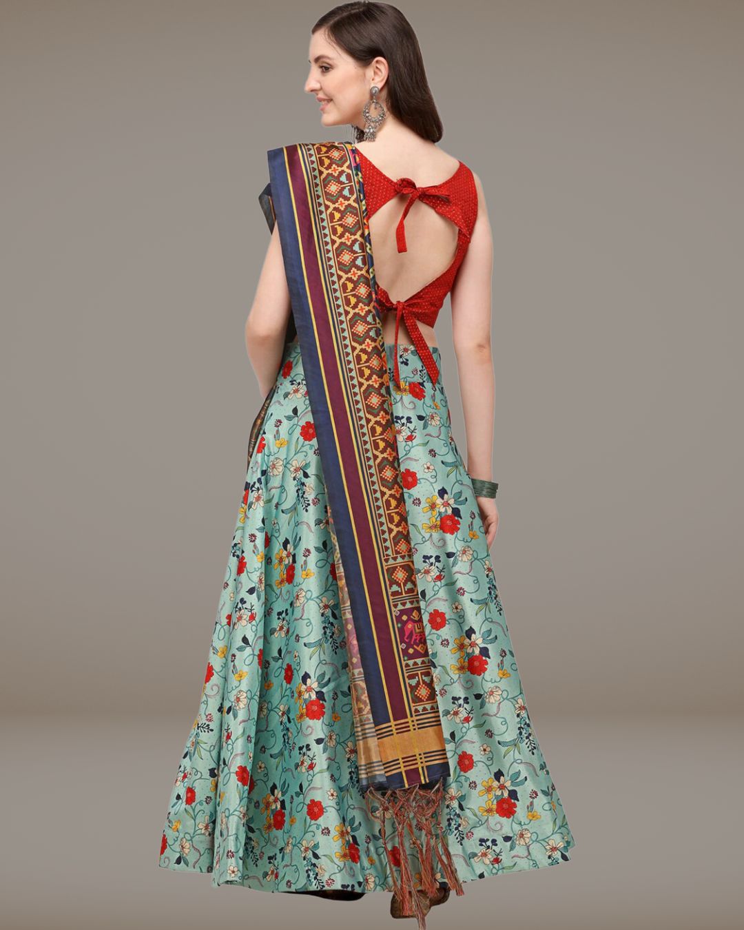 This sky blue festive Anarkali lehenga is crafted for women who love subtle yet striking ethnic wear. Made from satin silk blend with elegant digital prints, it comes with a soft silk blouse and a shiny silk dupatta to complete the premium look.