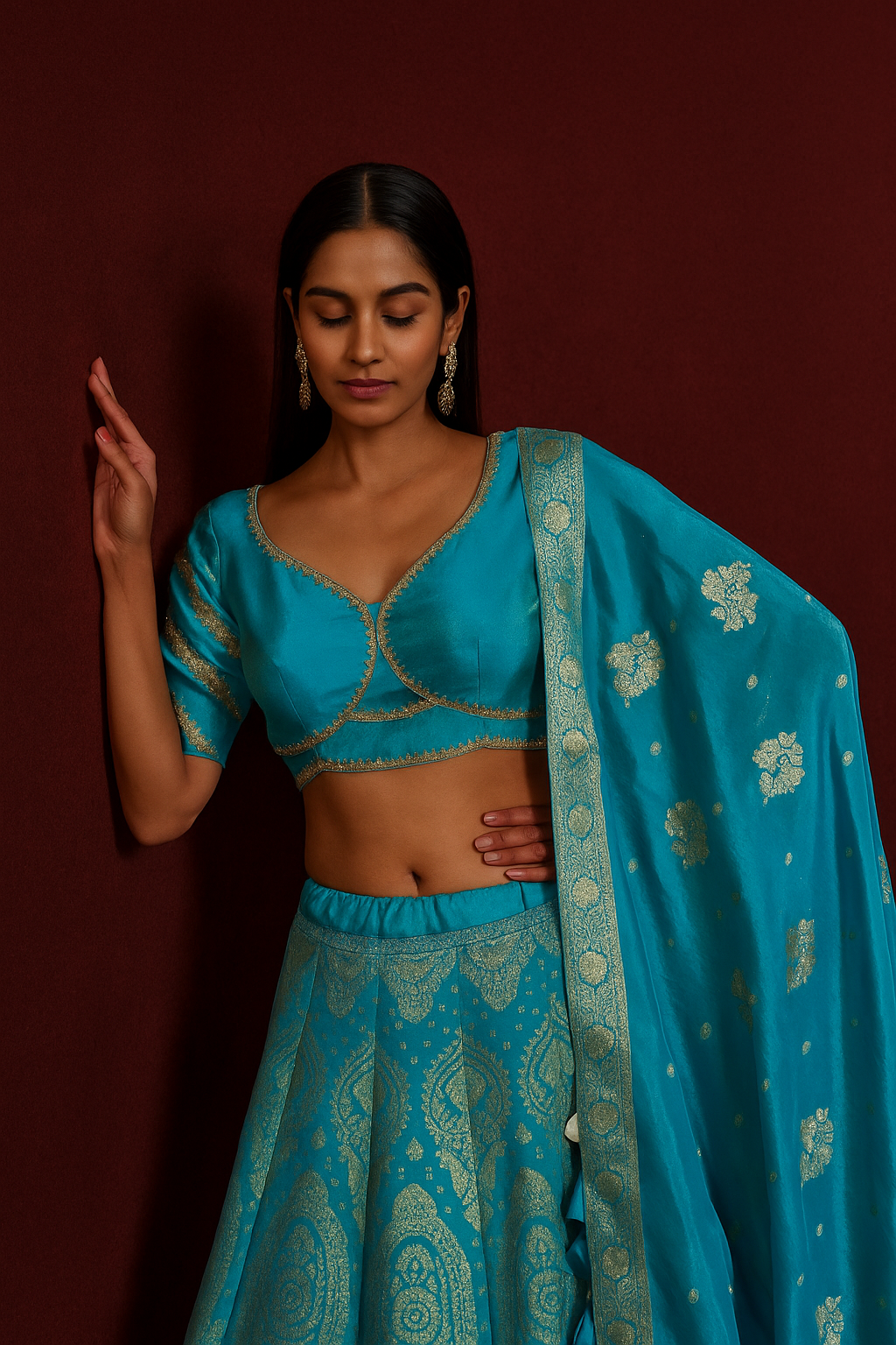 Fabric (Lehenga & Choli): Premium viscose Banarasi tissue fabric with lustrous finish