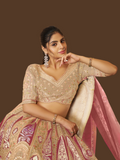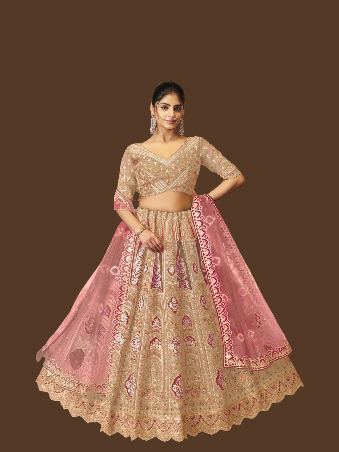 Subtle chiku tone lehenga with rich Banarasi silk elegance