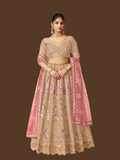This semi-stitched lehenga set in chiku color features Banarasi silk fabric, soft net dupatta, and unstitched blouse. Ideal for festive wear and ethnic gatherings.
