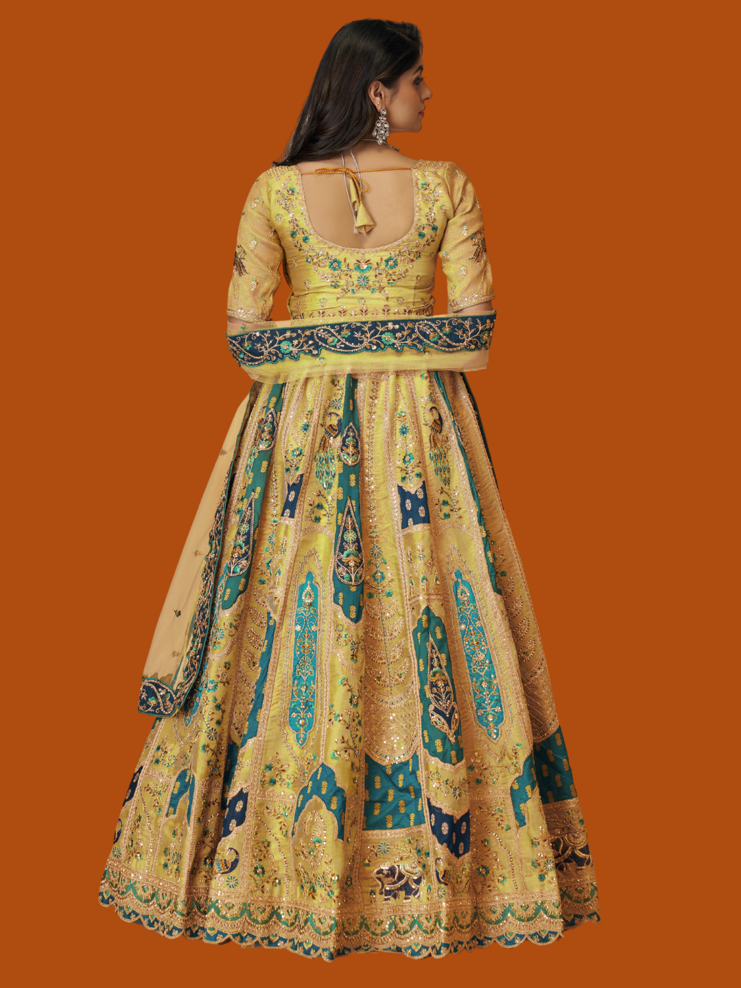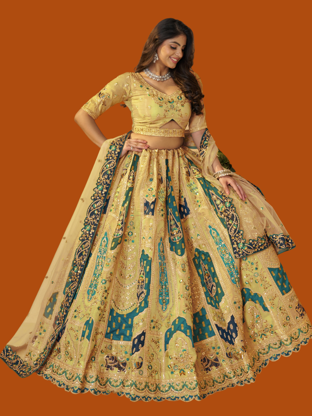 A semi-stitched lehenga in yellow Banarasi silk, paired with soft net dupatta and unstitched blouse. Perfect for haldi ceremonies and festive events.