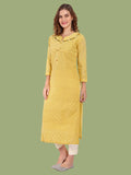 A cheerful yellow kurti in cambric cotton, ideal for festive and casual occasions. Available in M to 7XL.