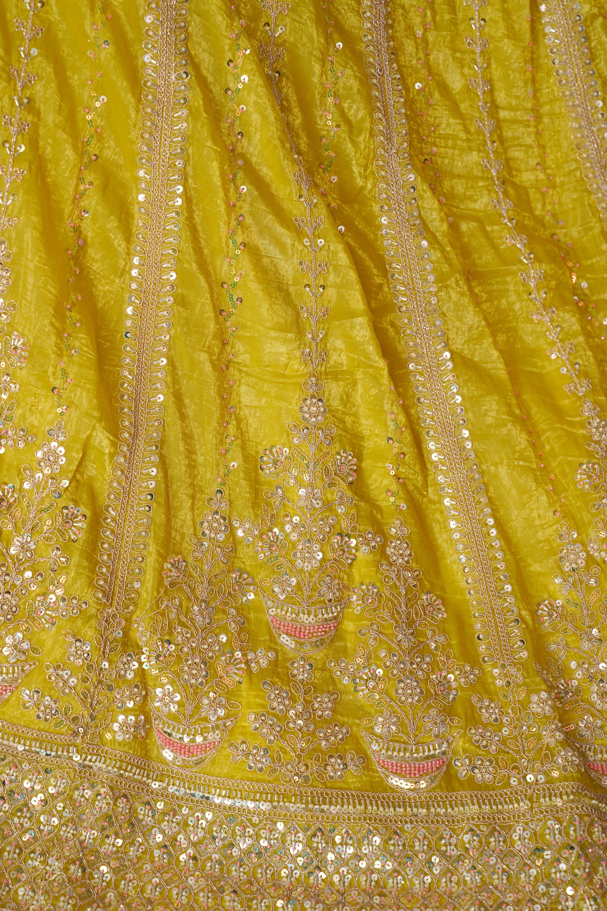 A semi-stitched lehenga in yellow Jimmy Choo fabric with soft net dupatta and unstitched blouse. Ideal for festive occasions.